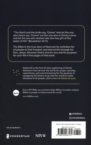 The full text of the accurate, readable, and clear New International Version (NIV)A letter from Jennie Allen and the Gather25 team to welcome readers to God’s WordAn invitation to follow Jesus, along with a video explaining the Gospel shared via a QR-code from the Gather25 teamA selection of Old Testament and New Testament mapsGetting to Know God – A step-by-step guide to becoming a follower of JesusAbout the Bible – Answers questions about what the Bible is, how it was written, and how it came to usPromises from the Bible – Scripture passages on 20 difficult, yet common, emotions everyone experiences30 Days for Beginning Your Walk with Christ reading plan that gives an overview of the Bible and God’s love for his peoplePerspectives from the Bible – Scripture passages on how to respond to 30 common life situations30 Days with Jesus reading plan that covers the life, death, and resurrection of JesusDouble-column formatExclusive Zondervan NIV Comfort Print® typefacePrint size: 9.9