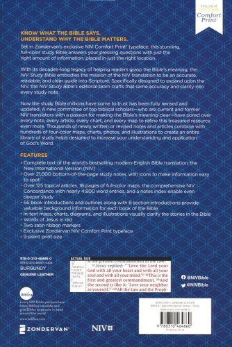 Over 21,000 bottom-of-the-page study notes, with icons to make important information easy to spotOver 125 topical articles, 16 pages of full-color maps, the Comprehensive NIV Concordance with nearly 4800 word entries, and a subject note index enable even deeper studySixty-six book introductions and outlines along with six section introductions provide valuable background information for each book of the BibleIn-text maps, charts, diagrams, and illustrations visually clarify the stories in the BibleTwo satin ribbon markersExclusive Zondervan NIV Comfort Print typefaceWords of Jesus in red9 point print size