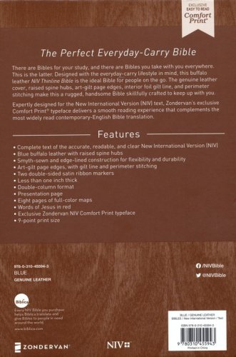 Complete text of the accurate, readable, and clear New International Version (NIV)Blue buffalo leather with raised spine hubsSmyth-sewn and edge-lined construction for flexibility and durabilityArt-gilt page edges, with gilt line and perimeter stitchingTwo double-sided satin ribbon markersLess than one inch thickDouble-column formatPresentation pageEight pages of full-color mapsWords of Jesus in redExclusive Zondervan NIV Comfort Print typeface9-point print size