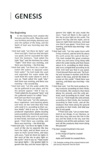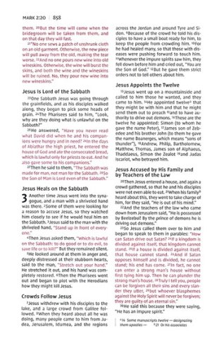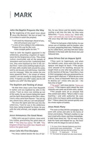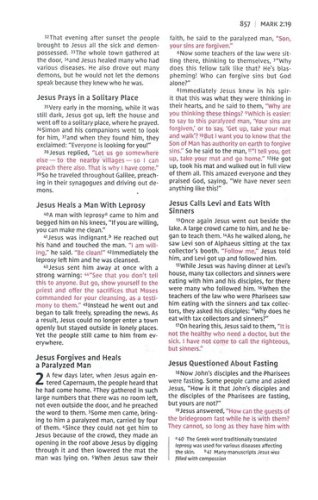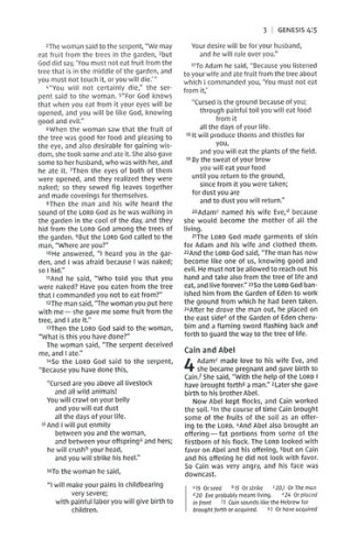 7-point print sizeLess than one inch thickDouble-column formatWords of Christ in redPresentation pageTwo satin ribbon markers