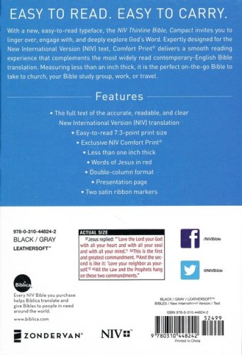 The NIV Thinline Compact Bible captures the depth and beauty of the Bible in a take-anywhere size. With a new custom typeface, this Bible also delivers a more pleasant reading experience. Measuring less than an inch thick, it is perfect to take to work, travel, church, and Bible study for on the go access to God's word.