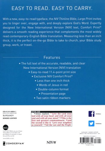 The NIV Thinline Bible, Large Print captures the depth and beauty of the Bible, in a take-anywhere size. With a new custom typeface, this Bible delivers a more pleasant reading experience, making it even easier to understand God's Word. Measuring less than an inch thick, it is perfect to take to work, travel, church, and Bible study for on-the-go access to God's word.
