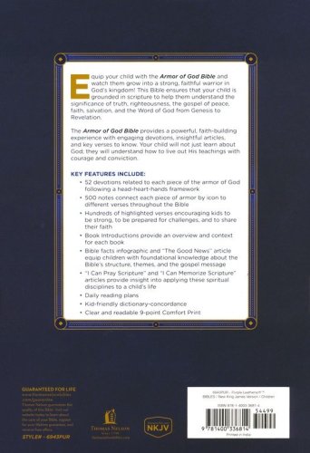 52 devotionals relate each piece of the armor of God following a head-heart-hands framework500 notes connect each piece of armor by icon to different verses throughout the BibleBe strong icons highlight verses that use the words "be strong"Battle icons highlight verses that have a physical or spiritual battleEvangelism icons highlight verses related to sharing our faithBook introductions provide an overview and context for each bookIntroductory article with custom artwork gives clarity on how to best use the features in the BibleBible facts infographic and "The Good News" article equip children with foundational knowledge about the Bibles structure, themes, and the Gospel message"I can Pray Scripture" and "I Can Memorize Scripture" articles provide insight into applying these spiritual disciplines to a child’s lifeReading plans provide guidance on how to read the Bible on a daily basis.Indexes to quickly find each feature found within the BibleKids dictionary and concordance help navigate the meaning and occurrences of terms in the BibleEasy-to-read 9-point NKJV Comfort Print®