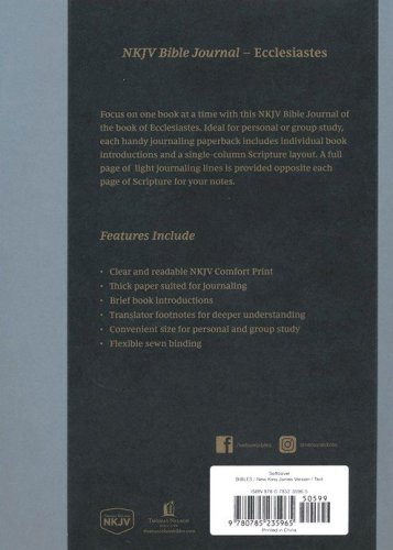 Focus on one book at a time with this NKJV Bible Journal of the Book of Ecclesiastes. Ideal for personal or group study, each handy journaling paperback includes individual book introductions and a single-column Scripture layout with a full page of light journaling lines opposite each page of Scripture.