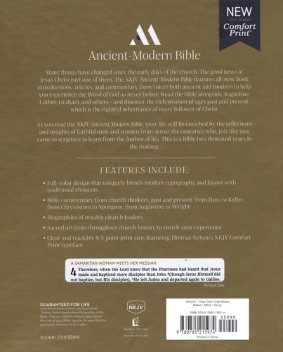 Many things have changed in the last two-thousand years. The good news of Jesus Christ isn’t one of them. The NKJV Ancient-Modern Bible features all-new book introductions, articles, and commentary from voices both ancient and modern to help you experience the Word of God as never before. Read the Bible alongside Augustine, Luther, Graham, and others—and discover the rich wisdom of ages past and present, which is the rightful inheritance of every follower of Christ. The NKJV Ancient-Modern Bible is an opportunity for readers to experience the Word of God with fresh eyes, as members of the global and historical community of faith. This is a Bible two thousand years in the making.