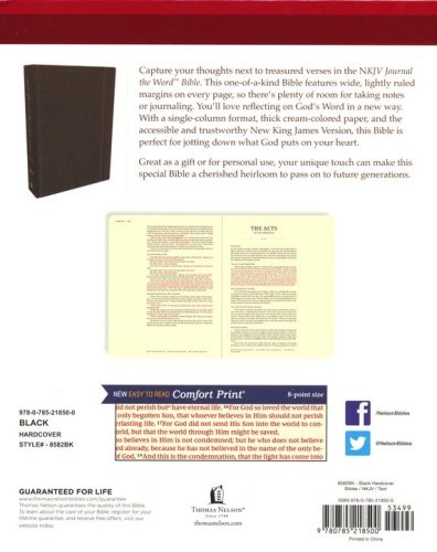 Designed with the exclusive Thomas Nelson NKJV Comfort Print® typeface Lined, wide margins for notes and reflections Premium paper for enduring note-takingWords of Christ in red Lays flat in your hand or on your deskTwo ribbon markers Easy-to-read 8.5-point print size