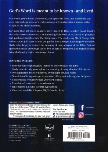 For more than 20 years, readers have turned to Bible teacher David Guzik’s verse-by-verse commentary at EnduringWord.com as a source of practical and pastoral insights into the Scriptures. The Enduring Word Study Bible invites you to join them as you are guided into deeper knowledge of the Bible. Study notes based on Guzik’s commentary help you to explore the meaning of every chapter of the Bible. Pastoral application notes guide you to live in light of Scripture, and feature articles bring challenging topics into sharper focus.