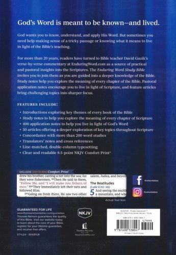 For more than 20 years, readers have turned to Bible teacher David Guzik’s verse-by-verse commentary at EnduringWord.com as a source of practical and pastoral insights into the Scriptures. The Enduring Word Study Bible invites you to join them as you are guided into deeper knowledge of the Bible. Study notes based on Guzik’s commentary help you to explore the meaning of every chapter of the Bible. Pastoral application notes guide you to live in light of Scripture, and feature articles bring challenging topics into sharper focus.