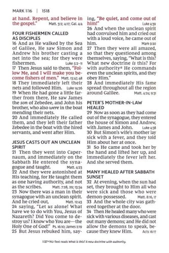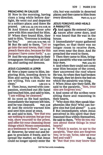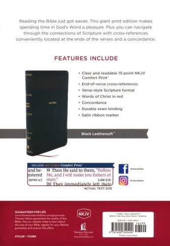 End-of-verse cross-references help you find related passages quickly and easilyVerse-style Scripture format starts each verse on a separate line, so it’s easy to navigate the textLine-matched for improved clarity when readingWords of Christ in red help you quickly identify Jesus’ teachings and statementsSmyth-sewn bindingConcordance for looking up a word’s occurrences throughout the BibleFull color maps show the layout of Israel and other biblical locations for better contextA ribbon marker to easily navigate and keep track of where you were readingClear and readable 13-point NKJV Comfort Print®