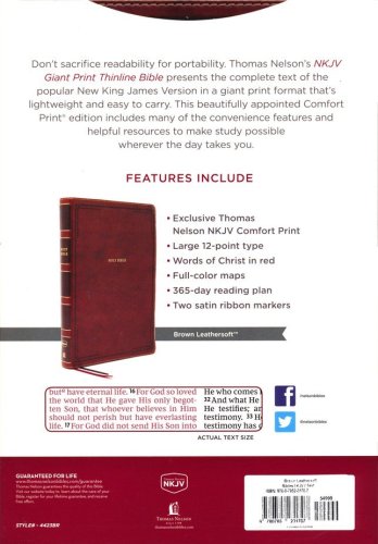 Clear and readable Thomas Nelson NKJV Comfort Print®Line-matched giant print 12-point type Words of Christ in redDurable and flexible Smyth-sewn bindingDouble ribbonsGilded page edges