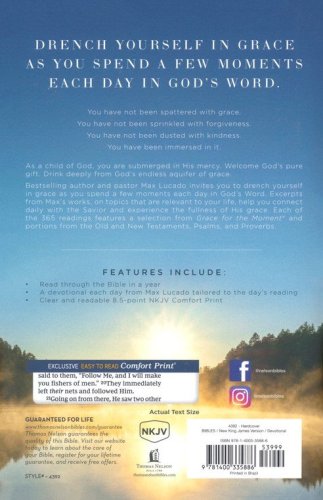 Read through the Bible in a year with portions of the Old and New Testaments, Psalms, and ProverbsA devotional each day from Max Lucado tailored to the day’s reading to easily connect God’s Word to your life365 daily readings from the first and second volumes of Grace for the Moment™Double-column layoutThe complete text of Scripture in the New King James Version of the BibleClear and readable 8.5-point NKJV Comfort Print®