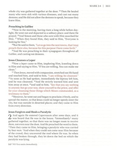 Lined, 2" wide margins for notes, reflections and artThicker cream paper for enduring note-takingFull text of the trusted New King James Version (NKJV) BibleSingle-column, paragraph formatWords of Jesus in redLays flat when openRibbon markerElastic closure for privacyLarge 10-point text size eases eyestrain when reading8.25" x 6.50" x 2.25"