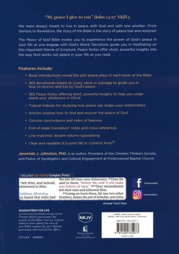 Book introductions to help reveal the part peace plays in each book of the Bible 365 devotionals based on a key verse or passage to guide you in how to receive and live by God’s peace365 peace notes offering short, powerful insights to help you understand more deeply the wholeness you have in ChristTopical indexes to help you study on your own how God's peace can shape different relationships in your lifeArticles explore what the peace of God is, how to find or recover it, and how to experience eternal salvation because of what God has done for youConcise concordance and index of featuresEnd-of-page translators’ notes and cross-referencesLine-matched, double-column typesettingClear and readable 9.5-point NKJV Comfort Print®