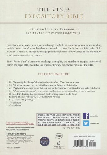 The Vines Expository Bible offers scriptural truth alongside guided explanations of key passages from influential preacher Dr. Jerry Vines. With biblical exposition and practical teaching culled from years of faithful ministry, Dr. Vines presents helpful insights from God's Word are presented in a warm, pastoral manner.