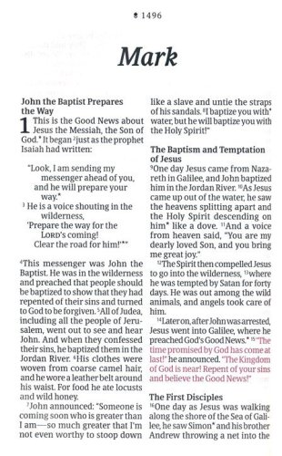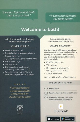 Features:New, easy-to-read page designsFilament content linked to every page!Readable large printHandy, thin sizeWords of Jesus in redQuality lay-flat Smyth-sewn bindingTyndale Verse FinderA Visual Overview of the BiblePresentation pageRibbon markerGilded page edgesFilament Bible app with free access to:25,000 study notes350+ videos40+ maps and infographics400+ profiles and articles1,500+ devotionalsLibrary of worship music