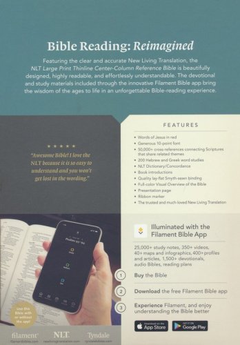 The NLT Thinline Center-Column Reference Bible, Filament-Enabled Edition, features a timeless and classic design and the clear and accurate New Living Translation (NLT). It also features the innovative Filament Bible app, which enables you to use your smartphone or tablet to connect every page to a vast array of related content, including study notes, devotionals, interactive maps, informative videos, and worship music.