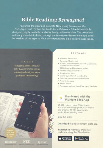 The NLT Thinline Center-Column Reference Bible, Filament-Enabled Edition, features a timeless and classic design and the clear and accurate New Living Translation (NLT). It also features the innovative Filament Bible app, which enables you to use your smartphone or tablet to connect every page to a vast array of related content, including study notes, devotionals, interactive maps, informative videos, and worship music.