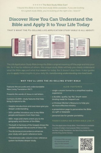Why You’ll Love the #1-Selling Study Bible:Features the accurate and understandable New Living Translation (NLT) The words of Jesus appear in red letterContains 10,000+ study features that help bring Scripture to life and show how the characters, teachings, and events of the Bible apply to your everyday lifeHelpful introductions and overviews for each Bible book give deeper understanding100+â·¯Life Applicationâ·¯profiles introduce you to key Bible characters and lessons from their lives500+ maps & charts orient you to the geography of the Bible16 pages of full-color maps for visual context of locations and events.Built-in harmony of the Gospels shows the parallels between accounts of Jesus’ life right in Bible textDictionary/concordance will enhance your study with quick reference to key terms and themes.Extensive side-column cross-reference system to facilitate deeper studyAlso features:Compact, portable sizeSingle-column format for a simplified reading experienceDurable, quality Smyth-sewn “lay flat” binding, made for frequent useChristian Worker’s Resource, a special supplement to help you do more effective ministryPresentation page to personalize the Bible as a gift or keepsakeThere’s simply no other Bible like it.