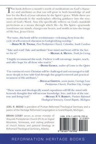 This book delivers a month’s worth of meditations on God’s character and attributes so that you will grow in both knowledge of and love for the Rock of your salvation by the Spirit’s grace. While there are many devotionals in the marketplace offering guidance into the treasures of God’s Word, None Else specifically reflects on God’s manifold perfections as a means through which He—by His Spirit—graciously transforms our minds, changes our hearts, and molds us into the image of His Son, Jesus Christ.