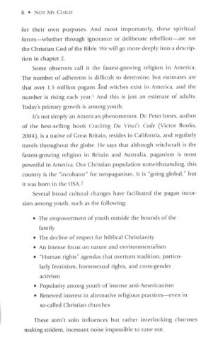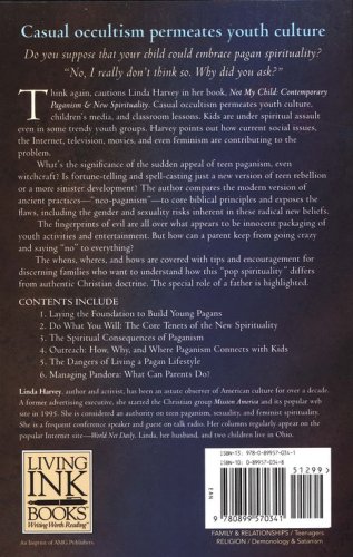 Think again, cautions Linda Harvey in her book, Not My Child: Contemporary Paganism & New Spirituality. Casual occultism permeates youth culture, children's media, and classroom lessons. Kids are under spiritual assault even in some trendy youth groups. Harvey points out how current social issues, the Internet, television, movies, and even feminism are contributing to the problem.