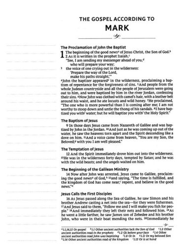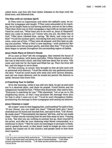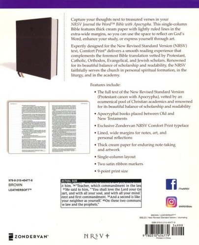 The full text of the New Revised Standard Version (Protestant canon with Apocrypha), vetted by an ecumenical pool of Christian academics and renowned for its beautiful balance of scholarship and readability Apocrypha placed between Old and New TestamentsExclusive Zondervan NRSV Comfort Print typefaceLined, wide margins for notes, art, and personal reflectionsThick cream paper for enduring note-taking and artworkSingle-column layoutTwo satin ribbon markers9-point print size