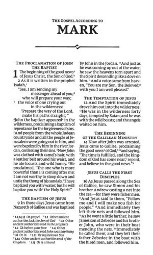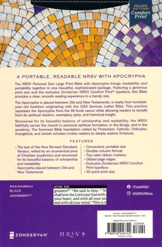 The text of the New Revised Standard Version, vetted by an ecumenical pool of Christian academics and renowned for its beautiful balance of scholarship and readabilityApocrypha placed between Old and New TestamentsConvenient, portable sizeDouble-column formatTwo satin ribbon markersGilded page edgesExclusive Zondervan NRSV Comfort Print typeface10-point print size