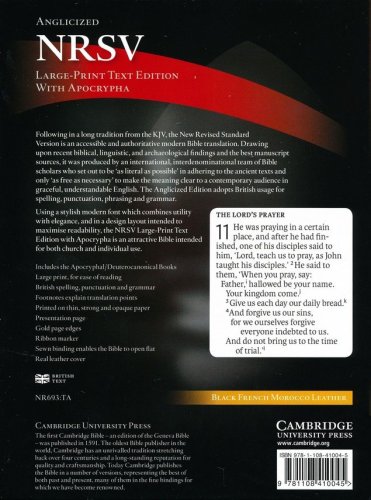 Offers extra-large, bold print for easy readingUses British spelling and punctuationIncludes the ApocryphaBound in black leather with gold page edges