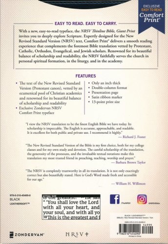 The full text of the New Revised Standard Version (66-book Protestant canon), vetted by an ecumenical pool of Christian academics and renowned for its beautiful balance of scholarship and readability Only an inch thickDouble-column formatPresentation pageSatin ribbon markerExclusive Zondervan NRSV Comfort Print typeface13-point print size