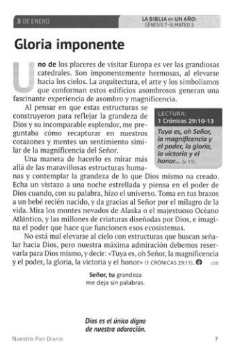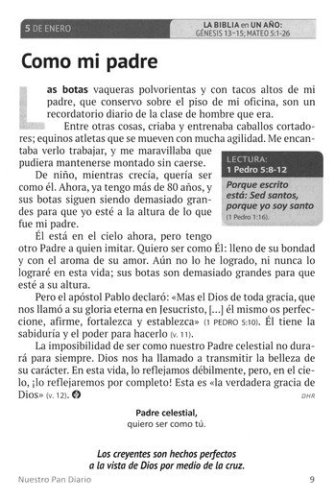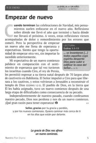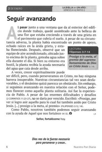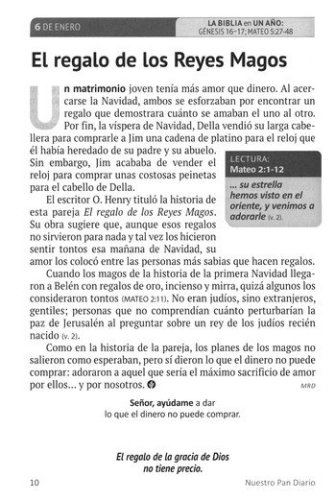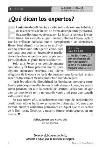With our hectic lives, it's easy for other things to interrupt or get in the way of spending time with the Lord. Our Daily Bread Volume 24 offers a meaningful way to consistently seek the Lord each day. This Spanish language 365-day devotional offers a meditation with a short story and Scripture passage that will help quiet your heart to hear from the Lord. Each author writes in way that makes you feel like you're talking with a friend and provides encouragement to keep your heart focused on Jesus. To help you stay close to God and stay rooted in the Word, a read-through-the-Bible-in-a-year plan is included. All of this inspiration is contained in a beautifully bound book with a memorable scenic landscape on the cover. Israel edition.