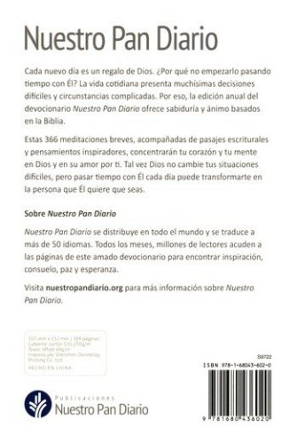 Debido a nuestras vidas tan ocupadas, es fácil que otras cosas interrumpan o se interpongan en nuestro caminar con el Señor. Nuestro Pan Diario Volumen 24 ofrece una manera inspiradora para buscar al Señor consistentemente cada día. Este devocional en Español de 365 días, le ofrece una meditación con una historia corta y un Pasaje de las Escrituras que le ayuda a apaciguar su corazón y le permite escuchar la voz del Señor. Cada autor escribe de una manera tal que le hace sentir que usted está hablando con un amigo quien le anima a mantener su corazón centrado en Jesús. Para ayudarle a mantenerse cerca del Señor y sumergido en la Palabra, se incluye también un plan de lectura para leer la Biblia en un año. Toda esta inspiración está incluída en un hermoso libro empastado con un paisaje escénico inmemorable en su pasta. Edición Israel.