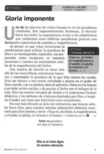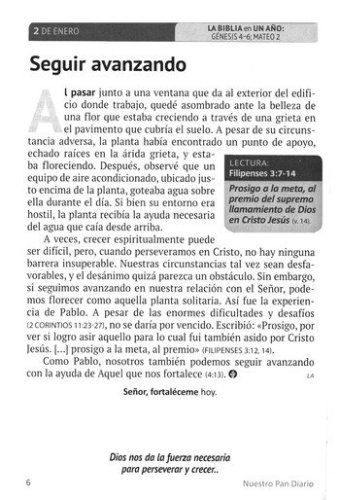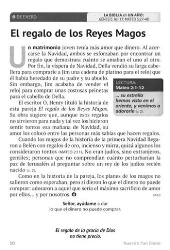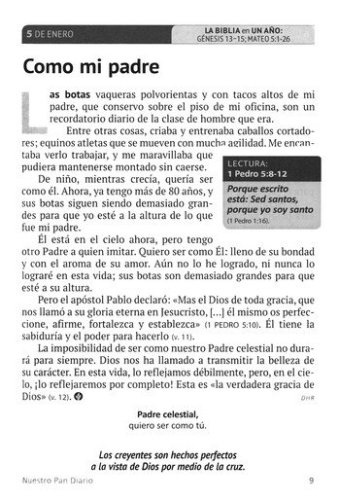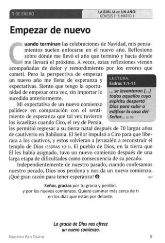 With our hectic lives, it's easy for other things to interrupt or get in the way of spending time with the Lord. Our Daily Bread Volume 24 offers a meaningful way to consistently seek the Lord each day. This Spanish language 365-day devotional offers a meditation with a short story and Scripture passage that will help quiet your heart to hear from the Lord. Each author writes in way that makes you feel like you're talking with a friend and provides encouragement to keep your heart focused on Jesus. To help you stay close to God and rooted in the Word, a read-through-the-Bible-in-a-year plan is included. All of this inspiration is contained in a beautifully bound book with a floral patterned cover. Gift box.