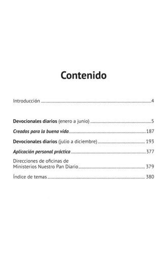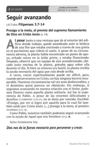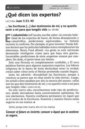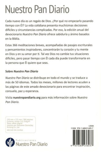 Debido a nuestras vidas tan ocupadas, es fácil que otras cosas interrumpan o se interpongan en nuestro caminar con el Señor. Nuestro Pan Diario Volumen 24 ofrece una manera inspiradora para buscar al Señor consistentemente cada día. Este devocional en Español de 365 días, le ofrece una meditación con una historia corta y un Pasaje de las Escrituras que le ayuda a apaciguar su corazón y le permite escuchar la voz del Señor. Cada autor escribe de una manera tal que le hace sentir que usted está hablando con un amigo quien le anima a mantener su corazón centrado en Jesús. Para ayudarle a mantenerse cerca del Señor y sumergido en la Palabra, se incluye también un plan de lectura para leer la Biblia en un año. Toda esta inspiración está incluida en un hermoso libro empastado, resaltando el texto impreso con letras grandes.
