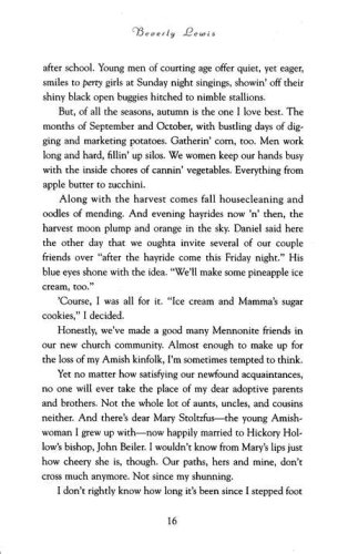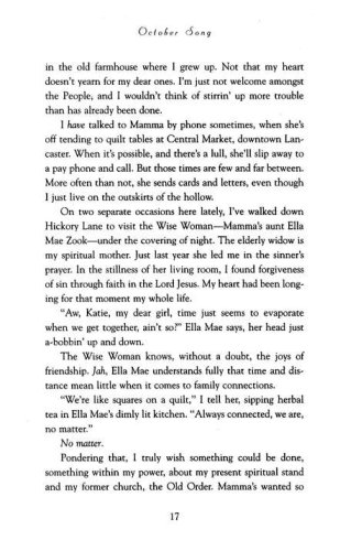 he acclimates to Amish life as an outsider… From the courtship of Lydia Cottrell and her betrothed, Levi King, to Sarah Cain, now a wife and mother struggling to bridge her own life with that of the People… October Song is overflowing with the simpler things of life that make a Lewis novel an unforgettable journey into the depths of the human heart.