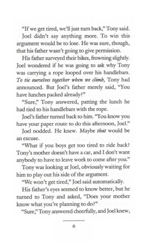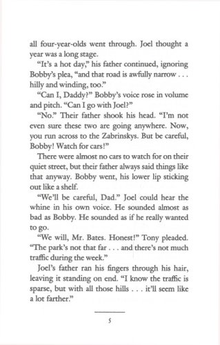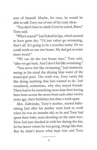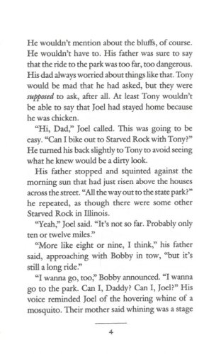 Joel's best friend Tony drowns while they are swimming in the forbidden, treacherous Vermilion River. Joel is terrified at having to tell of his disobedience and overwhelmed by his feelings of guilt.