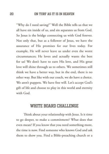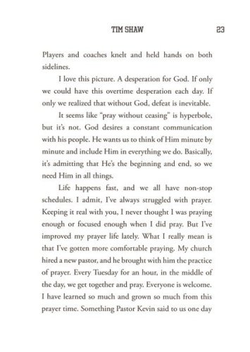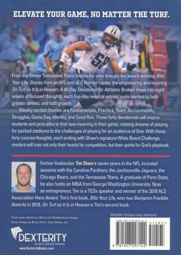 From the former Tennessee Titan linebacker who brought award-winning Blitz Your Life: Stories from an NFL and ALS Warrior comes the empowering and inspiring On Turf as It Is in Heaven: A 40-Day Devotional for Athletes. Broken down into eight weeks of focused thoughts, each five-day week of entries leads readers to both greater athletic and faith growth. Weekly section themes are: Fundamentals Practice Team Accountability Struggles Game Day Identity Good Run These forty devotionals will inspire students and pros alike to find new meaning in their game, relating dreams of playing for packed stadiums to the challenges of playing for an audience of One. Drawing on his time playing high school football in Michigan, as well as college-level play at Penn State, and his seven seasons in the NFL, Tim’s observations of his own faith journey on and off the field are conveyed in an easy, conversational tone, but relate universal truths. Over these 40 concise thoughts, each ending with Shaw’s signature Whiteboard Challenge, readers will train not only their hearts for competition, but their spirits for God’s playbook.