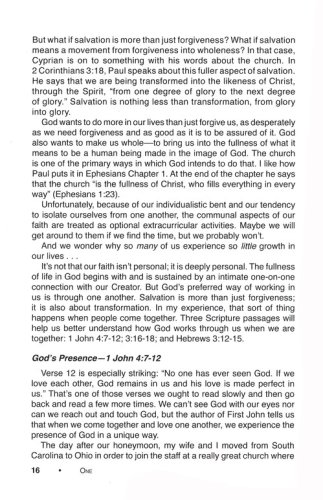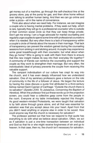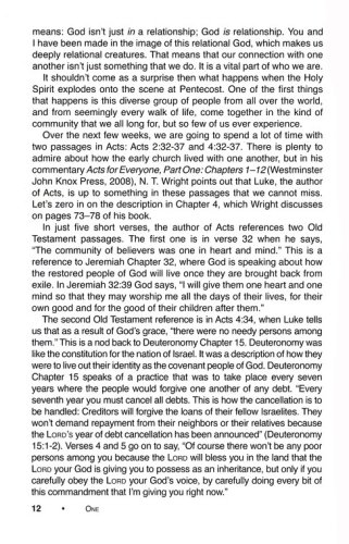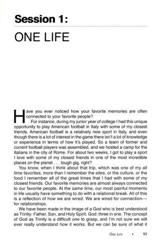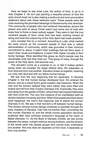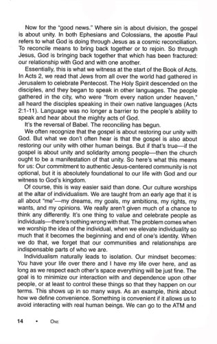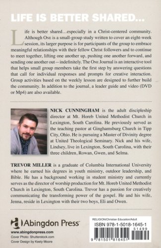 One is an eight-week small group study that leads readers to form a close-knit community in which they grow in faith together. Participants will discover the gifts that they have in one another; they will begin to move past skin-deep relationships and into intentional Christ centered community; and they will start to grow together spiritually. The eighth week is not an end; it is a beginning. When the small group finishes this study, they will be prepared to continue meeting as a community, growing in Christ together. They will be empowered to take the next steps of meeting regularly, determining their purpose and direction,deepening their faith, and serving in the community. They will be inspired to lift each other up, push each other forward, and send each other out.