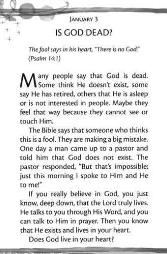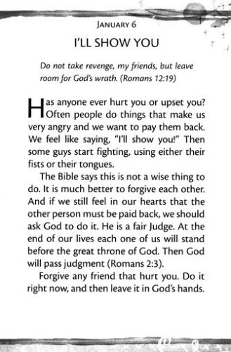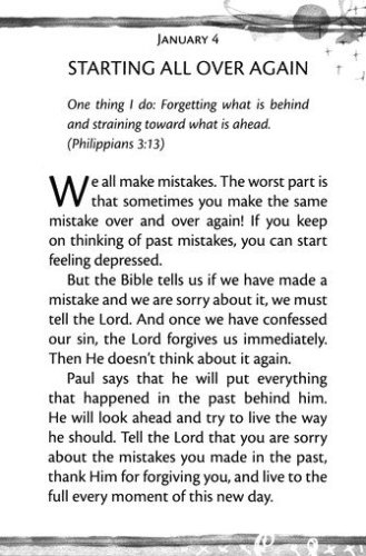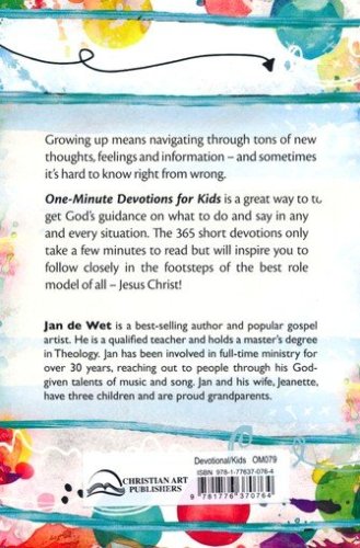 One-minute Devotions For Kids by Jan de Wet, Geared to tweens, ages 8 to 12 years old, readers will be guided to follow in Jesus' footsteps when making decisions while facing challenging situations at school or playing sports, by following God's Word. This one-minute devotional has a daily reading based on the calendar year, and a Scripture verse followed by devotional thought. Themes include the death and resurrection of Christ, obedience, the purpose of prayer, and much more. Paperback, 368 pages.