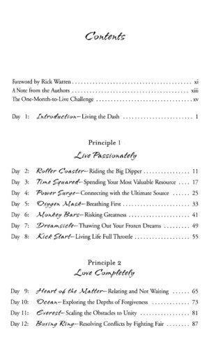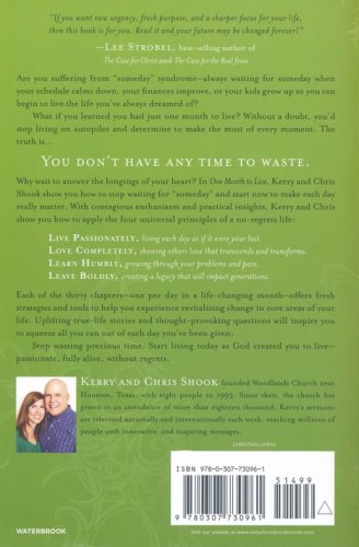 Why wait to answer the longings of your heart? In One Month to Live, Kerry and Chris Shook show you how to stop waiting for "someday" and start now to make each day really matter. With contagious enthusiasm and practical insights, you’ll learn how to apply the four universal principles of a no-regrets life: