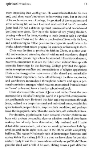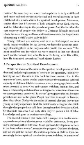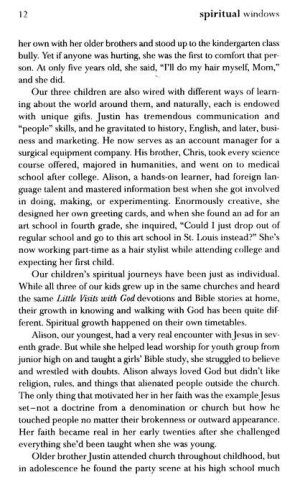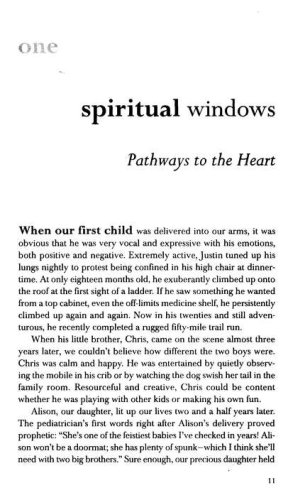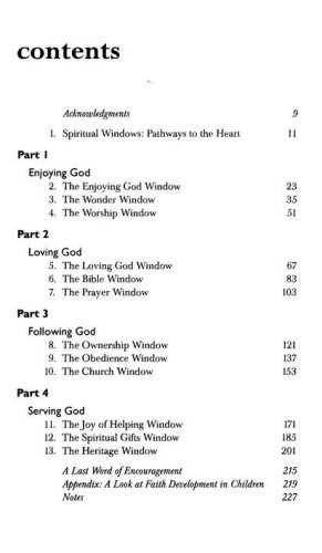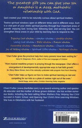 The greatest gift you can give your son or daughter is a deep, authentic relationship with God. God created your child to be naturally curious about spiritual matters. Twelve spiritual windows open at different times and in different ways. Each is a vital part of your child’s spiritual journey through four important areas of growth: enjoying God, loving God, following God, and serving God. You can strengthen these areas in your child by learning how to respond to the: Enjoying God Window Wonder Window Worship Window Loving God Window Bible Window Prayer Window Ownership Window Obedience Window Church Window Joy of Helping Window Spiritual Gifts Window Heritage Window Worship Window