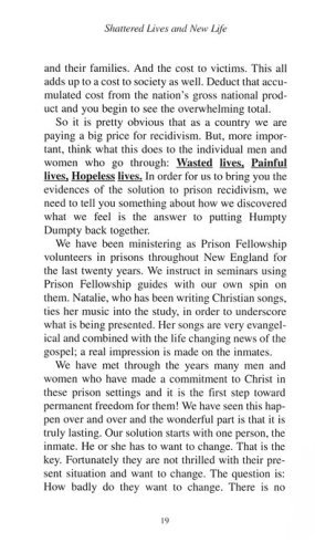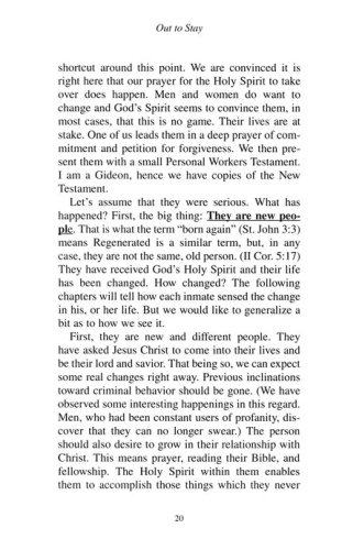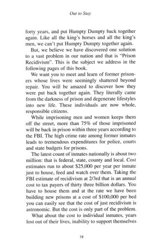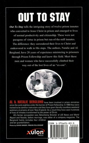 Out To Stay tells the intriguing story of twelve prison inmates who converted to Jesus Christ in prison and emerged to lives of normal productivity and citizenship. These were not paragons of virtue in prison but run-of-the-mill inmates. The difference: they surrendered their lives to Christ and endeavored to walk in His steps. The authors, Natalie and Al Berglund, have 20 years of experience ministering to prisoners through Prison Fellowship and know this field. Meet these men and women who have successfully climbed their way out of the lost lives of an "ex-con".
