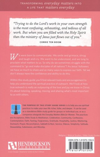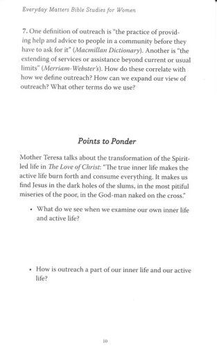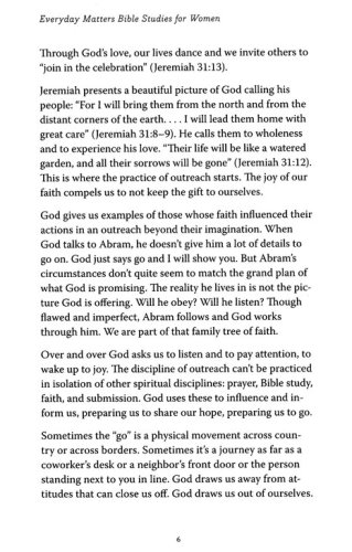 The Outreach Bible study looks at how true outreach is really an outpouring of the love and joy we know in Christ. It’s about listening, speaking, moving, and sharing what’s most important to us with others. Part of the Everyday Matters Bible Studies for Women series, it offers encouragement as you develop the spiritual practice of outreach. Each chapter concludes with study questions, points to ponder, prayer, and a take-away-treasure. A Leader’s Guide is included in the book.