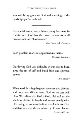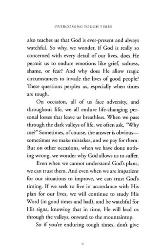 Scripture, devotions, and encouragement from influencers who have overcome difficulties combine in this touchstone of a book. As part of your daily devotions or as a reference when you are discouraged, Overcoming Tough Times has the insight and motivation you need to persevere.