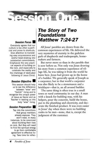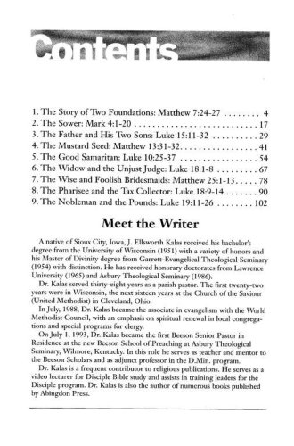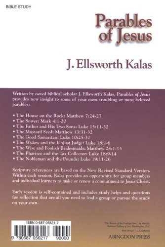 9 sessions. One of today's most exciting biblical writers, J. Ellsworth Kalas, explains nine of the parables Jesus used to present eternal truths. Scripture passages referenced are from the New Revised Standard Version. Parables covered include: -The House on the Rock (Matthew 7:24­27) -The Sower (Mark 4:1­20) -The Father and His Two Sons (Luke 15:11­32) -The Mustard Seed (Matthew 13:31­32) -The Good Samaritan (Luke 10:25­37) -The Widow and the Unjust Judge (Luke 18:1­8) -The Wise and Foolish Bridesmaids (Matthew 25:1­13) -The Pharisee and the Tax Collector (Luke 18:9­14 -The Nobleman and the Pounds (Luke 19:11­27) Parables of Jesus is an excellent resource for use with adult study groups, or for independent study. Leader helps and discussion questions are included within each chapter. Each session also includes an invitation to make or reaffirm a commitment to Jesus Christ. Includes a study guide.