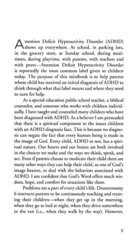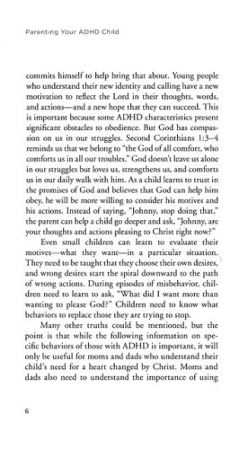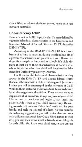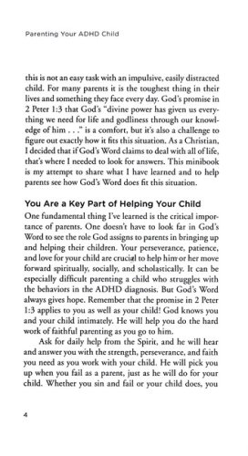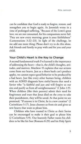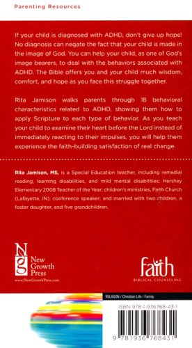 Rita K. Jamison walks parents through eighteen behavioral characteristics related to ADHD, showing them how to apply Scripture to each type of behavior. As you teach your child to examine their heart before the Lord instead of immediately reacting to their impulses, you will help them experience the faith-building satisfaction of real change.