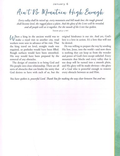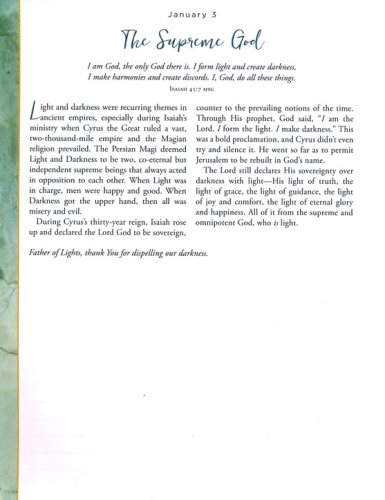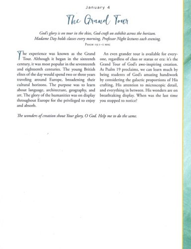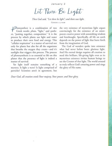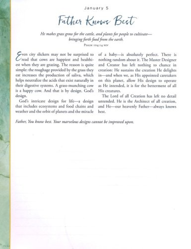 Archive quality, non-bleed paperAcid-free paper and inkDaily devotional with lightly ruled space for responses, lists, or journalingFull-color interior designPresentation page for personalizationLay-flat bindingFoil, ribbonClosure band