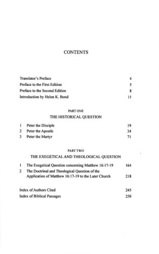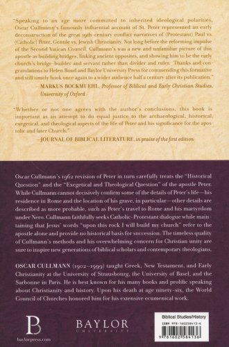 Oscar Cullmann's 1962 revision of Peter in turn carefully treats the "Historical Question" and the "Exegetical and Theological Question" of the apostle Peter. While Cullmann cannot decisively confirm some of the details of Peter's life—his residence in Rome and the location of his grave, in particular—other details are described as more probable, such as Peter's travel to Rome and his martyrdom under Nero. Cullmann faithfully seeks Catholic-Protestant dialogue while maintaining that Jesus' words—"upon this rock I will build my church"—refer to the apostle alone and provide no historical basis for succession. The timeless quality of Cullmann's methods and his overwhelming concern for Christian unity are sure to inspire new generations of biblical scholars and contemporary theologians.