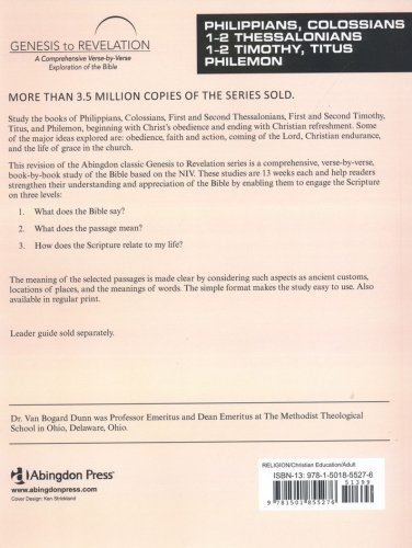 Study the Books of Philippians, Colossians, 1-2 Thessalonians, 1-2 Timothy, Titus, and Philemon beginning with Christ’s obedience and ending with the Christian refreshment. Some of the major ideas explored are: obedience, faith and action, coming of the Lord, Christian endurance, and the life a grace in the church.<.p> More than 3.5 million copies of the series have been sold. This revision of the Abingdon classic Genesis to Revelation Series is a comprehensive, verse-by-verse, book-by-book study of the Bible based on the NIV. These studies help readers strengthen their understanding and appreciation of the Bible by enabling them to engage the Scripture on three levels: What does the Bible say? Questions to consider while reading the passage for each session. What does the passage mean? Unpacks key verses in the selected passage. How does the Scripture relate to my life? Provides three major ideas that have meaning for our lives today. The meaning of the selected passages are made clear by considering such aspects as ancient customs, locations of places, and the meanings of words. The meaning of the selected passages are made clear by considering such aspects as ancient customs, locations of places, and the meanings of words. The simple format makes the study easy to use. Includes maps and glossary with key pronunciation helps. Updates will include: New cover designs. New interior designs. Leader Guide per matching Participant Book (rather than multiple volumes in one book). Updated to 2011 revision of the New International Version Translation (NIV). Updated references to New Interpreters Dictionary of the Bible. Include biblical chapters on the contents page beside session lesson titles for at-a-glance overview of biblical structure. Include larger divisions within the contents page to reflect macro-structure of each biblical book. Ex: Genesis 1-11; Genesis 12-50; Exodus 1-15; Exodus 16-40; Isaiah 1-39; Isaiah 40-66. The simple format makes the study easy to use. Each volume is 13 sessions and has a separate leader guide.