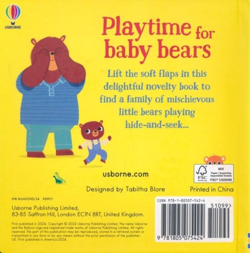 Lift the soft flaps in this delightful novelty book to find a family of playful little bears playing hide and seek. Table cloths, curtains, washing on the line… there are all kinds of soft things that bear cubs just love to hide behind! On the last page there's an extra surprise when all the bears are revealed hiding in the same place. With adorable artwork and a cute cub to discover on each page, this is a perfect book for babies and toddlers to curl up with. Ages Baby-2