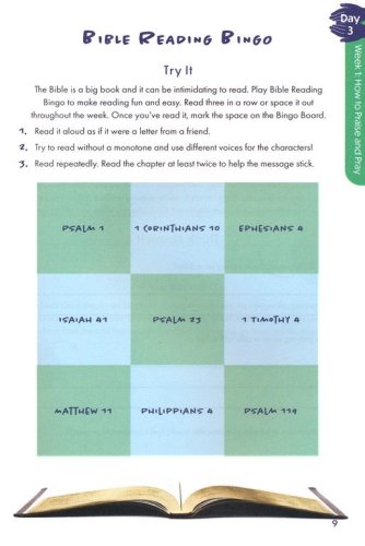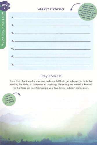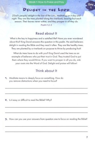 The book is split into two sections, "Praise" and "Prayer." Each devotional is around two pages long, and includes a Bible reading, life-application questions, writing of praises or prayers, suggested prayer, and suggestions for living out Bible truths.