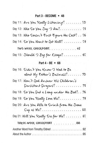 This three-week experience will bring you and a spiritual mentor of your choice into a 21-day prayer partnership that will change your life. You will read about people in the Bible who are just like you… Asking questions. Avoiding questions. People in discovery. Getting beyond just getting by. When you wrestle with their stories, you will open doors for your journey of discovery.